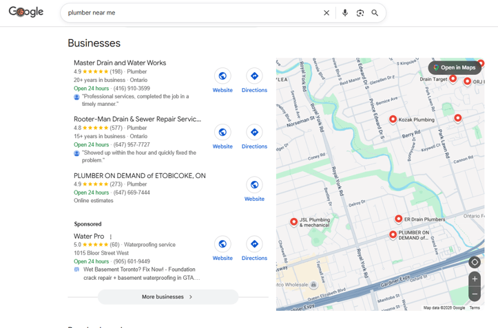 To understand why this matters, let’s look at what the local pack actually is. When someone searches for something like “plumber near me” or “HVAC repair in Toronto”, the first thing they see (right below the ad section) is a map with three business listings. That section is called the local pack, which includes: